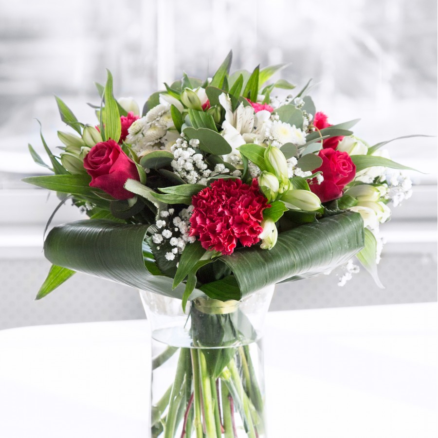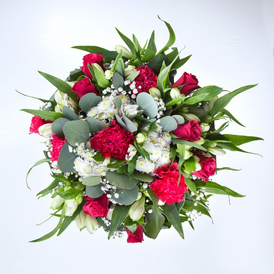 Experience the exquisite beauty of our exclusive bouquet, thoughtfully designed to inspire creativity and joy. This stunning arrangement features a harmonious blend of vibrant red roses and delicate white chrysanthemums, complemented by soft gypsophila and carnations.