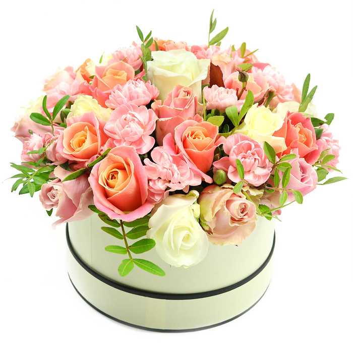 Immerse yourself in the enchanting blend of tender pink and white hues with this luxurious arrangement. Expertly designed to evoke deep emotion, our bouquet harmonizes orange, pink, yellow, and white roses with the delicate charm of pink carnations and a touch of fresh greenery. Each flower is meticulously hand-selected to ensure ultimate freshness and vibrant quality that lasts for 5 days. Presented in an exquisitely designed box, this arrangement offers that extra special impact when delivered.
