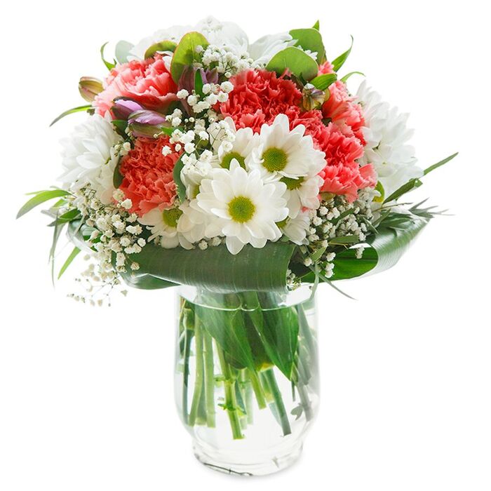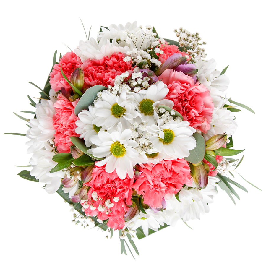 This refined bouquet is designed to brighten any day with its luxurious blend of soft and elegant hues. Featuring pristine white chrysanthemums, delicate gypsophila, and charming light pink carnations intertwined with lush aspidistra leaves, every flower is carefully hand-selected to deliver exceptional freshness and beauty. The result is a sophisticated design that stands out in any setting.